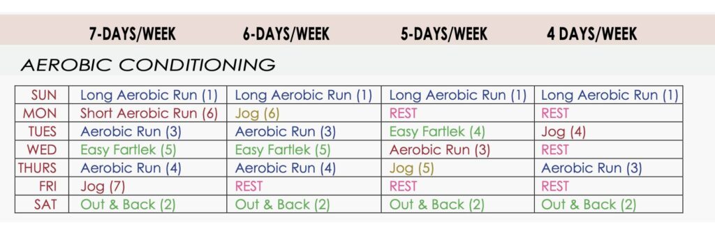The image below offers a classic approach to building your aerobic base. I’ll be posting specifics about how to go about it properly throughout this week. Whether your goal weekly mileage is 25 miles per week, 40, 60 or more, each mile is in investment in health, aerobic capacity, and a strong chassis. The definition of an aerobic run is one that feels comfortable and you can hold your end of a conversation with a running buddy.