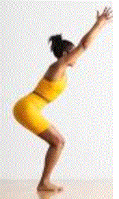 • Stand with knees bent, butt pointing backwards, straight back angled up and forward, and arms raised. Add a heel lift to the pose by lifting both heels off the ground.